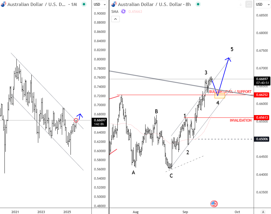 From an Elliott Wave perspective, I also like the impulsive characteristics on Aussie from the August 22nd close. In my view, we are still in an incomplete five-wave cycle, with the recent push beyond the July highs being wave three. After the next pullback in wave four, there could be a strong rebound, with the 0.6625 level standing out as attractive support on dips. I’ll certainly keep a close eye on this zone if a retracement occurs.It’s also worth noting that Aussie is now trying to break the trendline from the 2021 highs, which could be an interesting breakout point and support the recovery, at least until the five-wave cycle completes on the 8-hour chart.