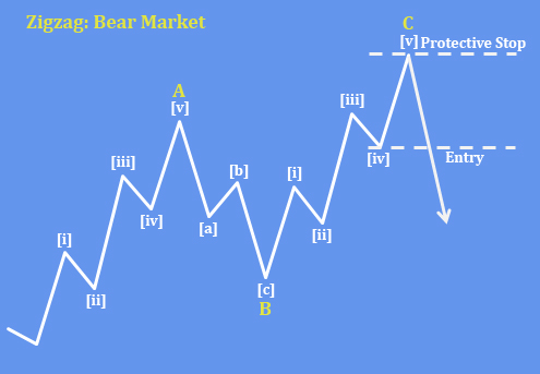 A zig-zag correction is one of the most common Elliott Wave corrective patterns and follows a 5–3–5 structure labeled A–B–C.