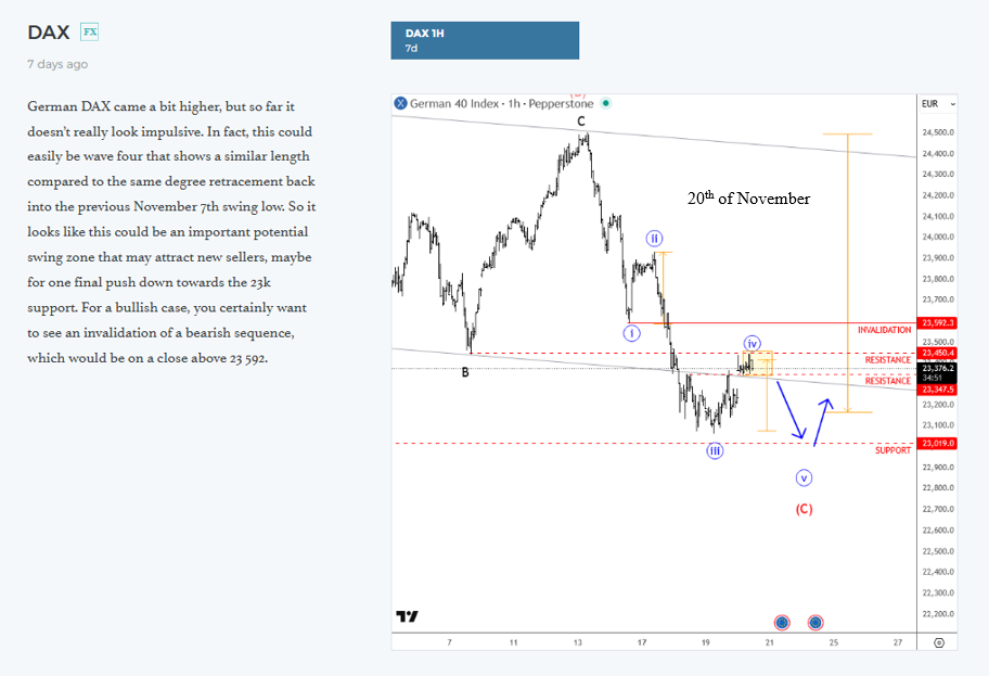 “German DAX came a bit higher, but so far it doesn’t really look impulsive. In fact, this could easily be wave four that shows a similar length compared to the same degree retracement back into the previous November 7th swing low. So it looks like this could be an important potential swing zone that may attract new sellers, maybe for one final push down towards the 23k support. For a bullish case, you certainly want to see an invalidation of a bearish sequence, which would be on a close above 23 592”