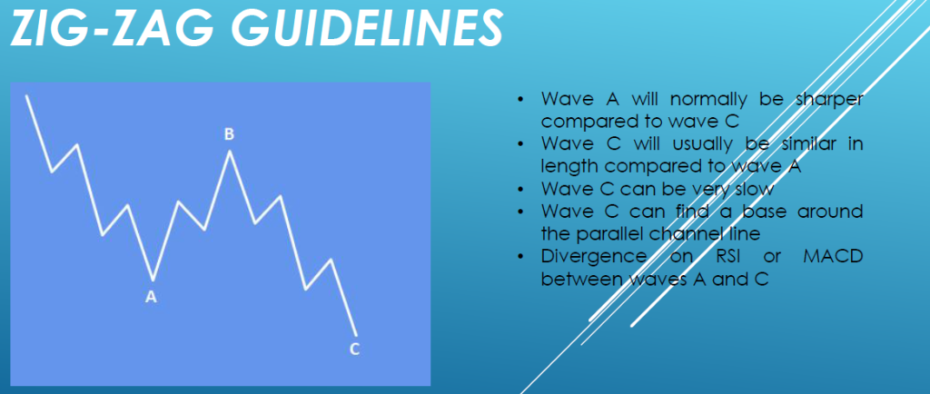 In Elliott Wave Theory, a zig-zag correction is a type of corrective wave pattern that typically unfolds in a three-wave structure labeled A-B-C. This pattern is characterized by its sharp and deep retracement against the prevailing trend. The first wave A moves in the direction opposite to the main trend. The second wave B retraces a portion of Wave A but does not go beyond its starting point. The third wave C moves in the same direction as Wave A and often extends beyond its end, completing the correction.
