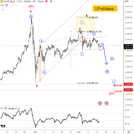 Moving forward, as Gold was consolidating, you could have seen many traders on social media calling for higher prices as the war between US/Israel and Iran was escalating – but instead, the trading pair reversed sharply and is down -16% percent from the highs. We have stayed on track once again with market and price has respected our projected waves