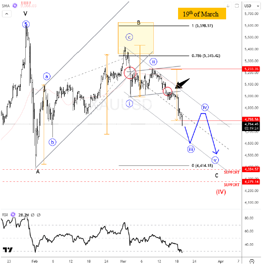 Today, 19th of March – we sent out another update, confirming that Gold broke down from our projected channel and was accelerating the higher degree wave C corrective trend. We offer you part of this analysis today for free: