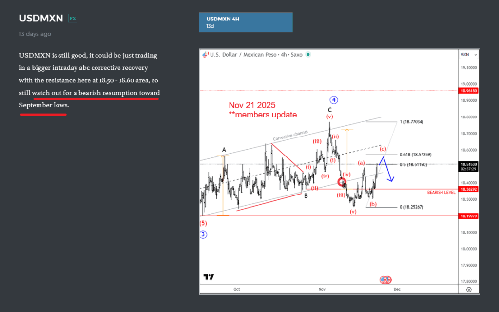 “USDMXN is still good, it could be just trading in a bigger intraday abc corrective recovery with the resistance here at 18.50 – 18.60 area, so still watch out for a bearish resumption toward September lows”