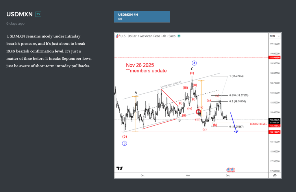The bearish tone in USD/MXN remains intact, with traders watching key levels for confirmation of the next leg lower. We are consistently updating daily this forex pair, and let’s see what we said about it almsot a mont back, on Nov 05.