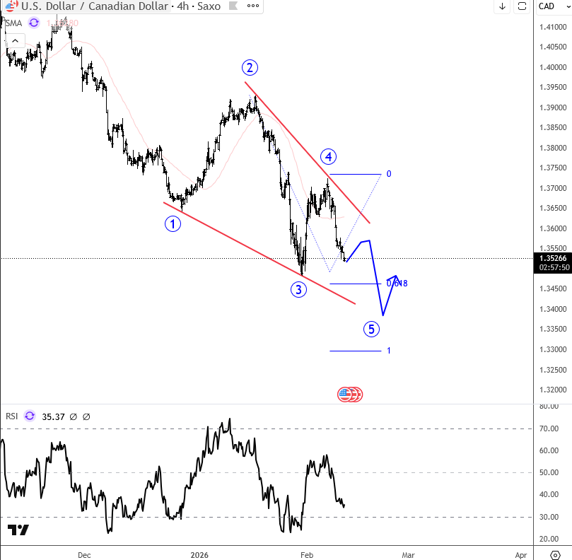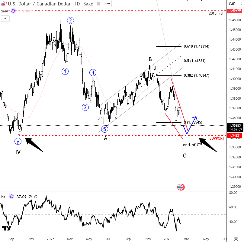 USDCAD is moving to the downside and we now have a new swing high from around the 1.3720 area. This suggests an ongoing impulsive structure rather than the complex triangle in the B wave that we discussed in our previous update. It seems that another low could still be coming then, but there is very strong and important support around 1.34. That area could trigger a strong reversal, based on a wedge shape, so we should be aware of a potential rebound.