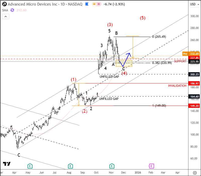AMD is approaching support, while it's finishing a correction, which can resume the bullish trend from a technical point of view and by Elliott wave model.