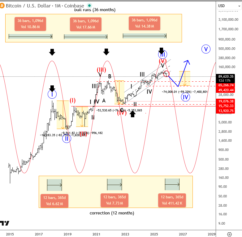 Bitcoin is showing warning signals that suggest the bull cycle is completing following the October top, based on cyclical, technical, and Elliott Wave analysis.