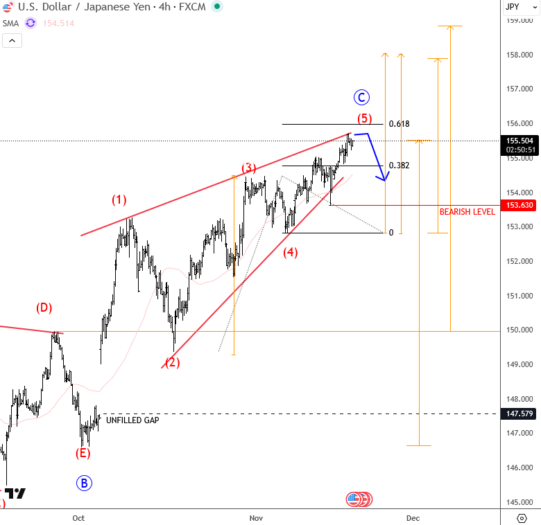 USD/JPY can be forming and potentially finishing an ending diagonal a.k.a. wedge pattern, which can limit the upside from a technical and Elliott wave perspective.