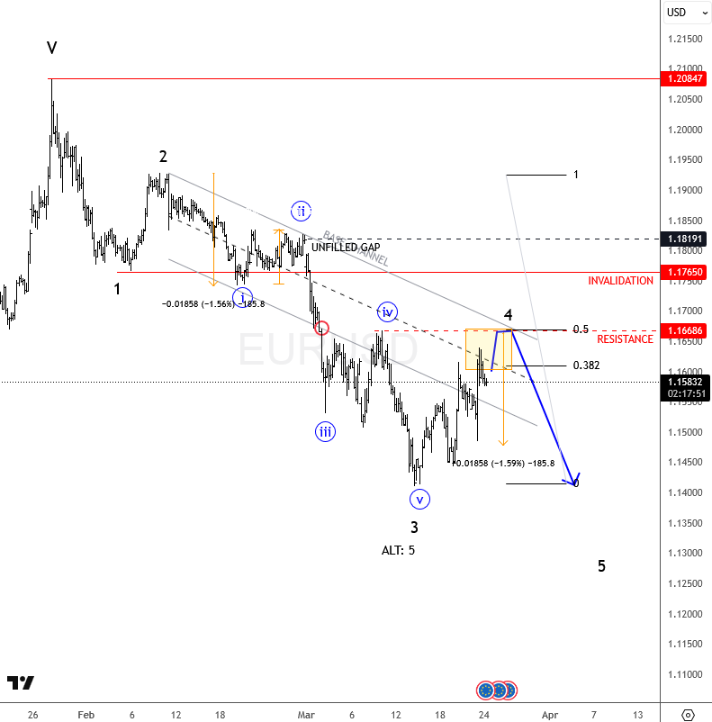 EURUSD has been in a downtrend since early February and weakness may resume. The sharp drop from 1.1930 likely ended wave 3, so the current rebound is probably wave 4 with 1.1660–1.1670 seen as an important resistance zone.